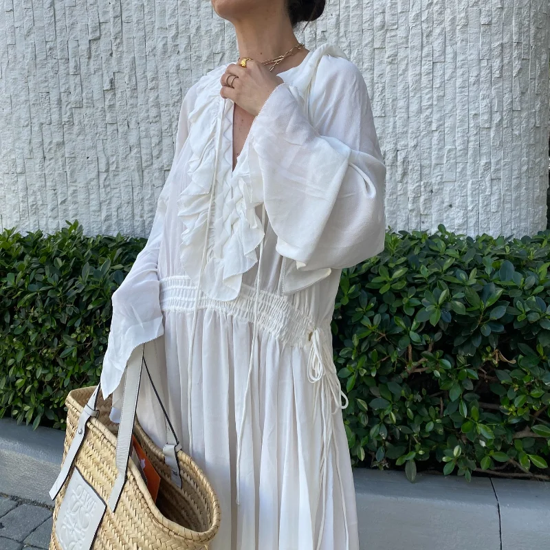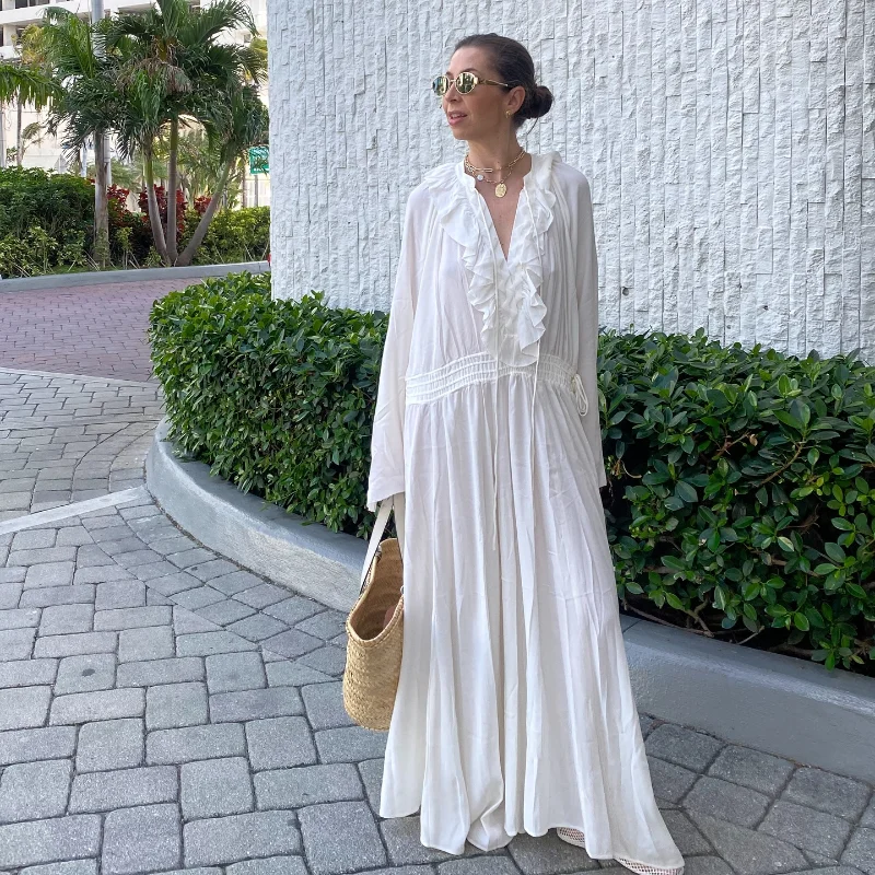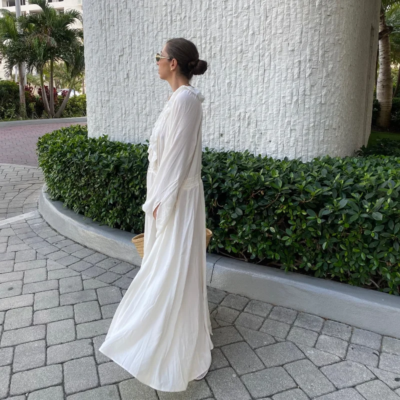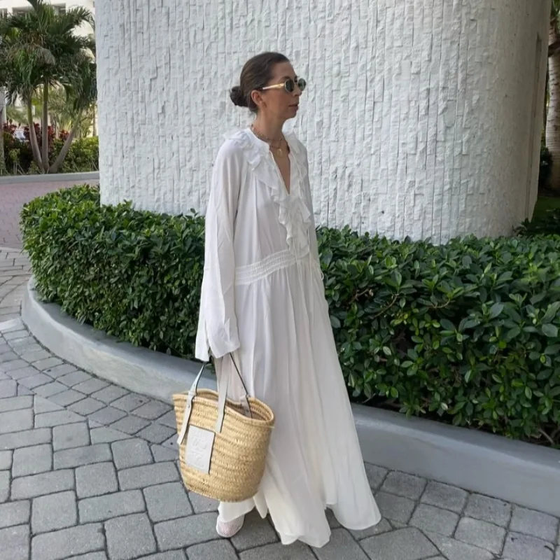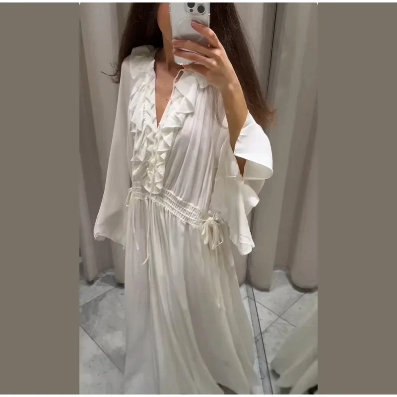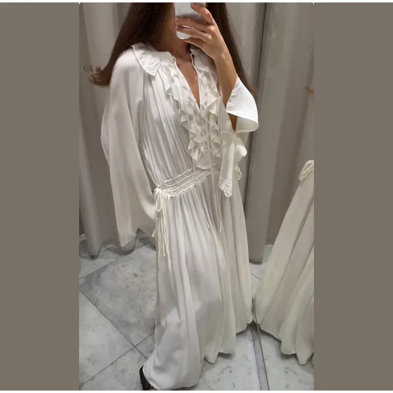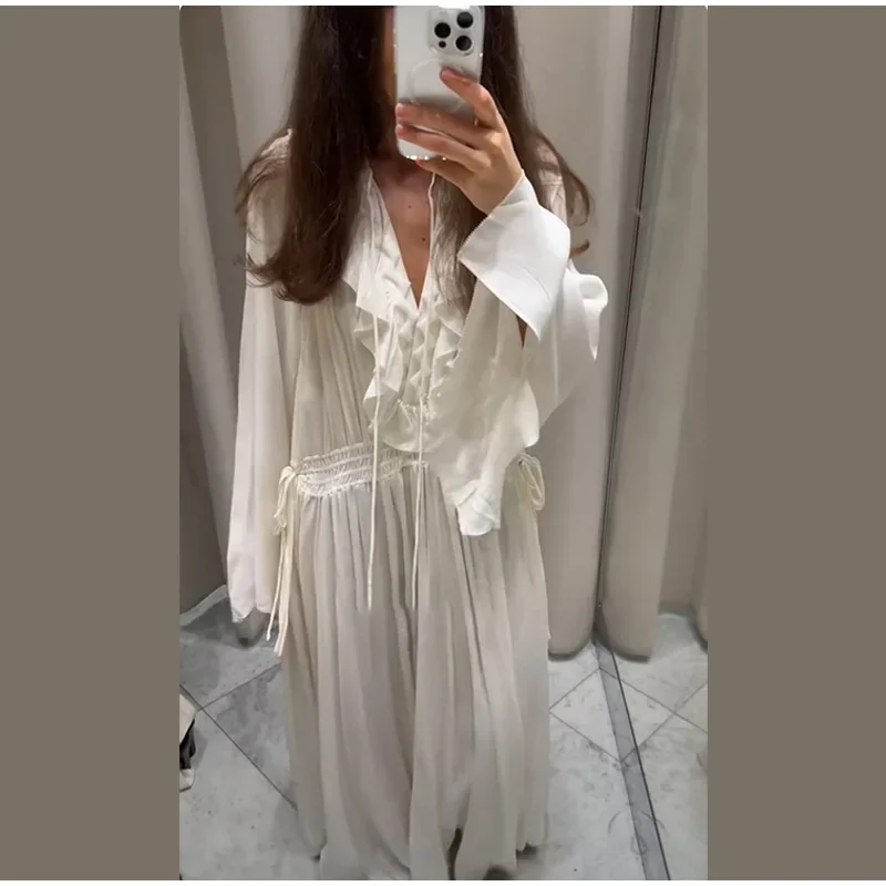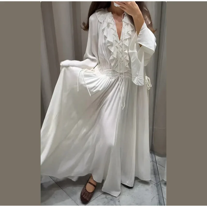 Elegant White Loose Guaze Long Dresses Woman Casual V Neck Flare Full Sleeve Long Robes New Female High Street Office Dress 2025